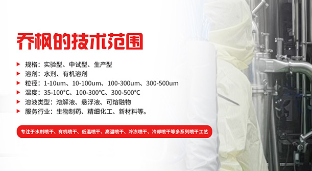 上海喬楓實業有限公司,成立于2012年,是從事噴霧干燥設備的研發設計、生產、銷售(小型噴霧干燥機實驗型噴霧干燥機,35℃低溫噴霧干燥機,有機溶劑噴霧干燥機,低溫閉式循環噴霧干燥機超細粉末噴霧干燥機噴霧冷凍干燥機真空噴霧干燥機、氣流噴霧干燥機,噴霧造粒干燥機離心噴霧干燥機沸騰制粒機等)和售后于一體的綜合性公司,本公司現成為一家致力于為生物制藥、精細化工、新能源、陶瓷造粒及食品工程等領域提供全套解決方案的整線交鑰匙工程企業。